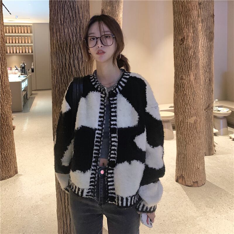 セーター カーディガンジャケット ブラックホワイト格子柄ルーズスタイルスプリングトップス 春物 ブラックストロベリース37888653104