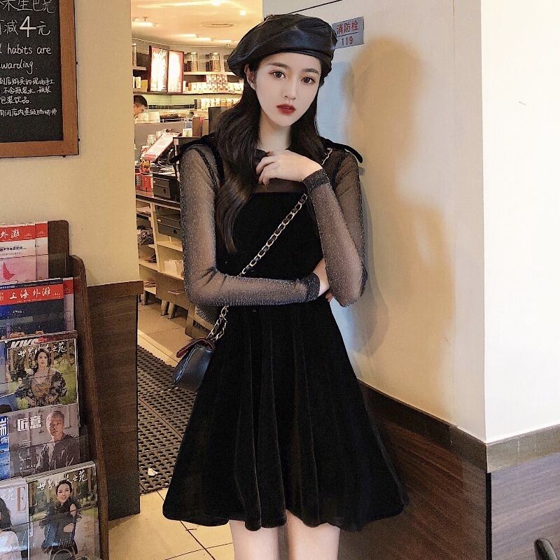 ベルベットドレス スタンダードショートスカート スプリングウェスト薄手ブラック レトロ 春物 ブラックストロベリース2533304272