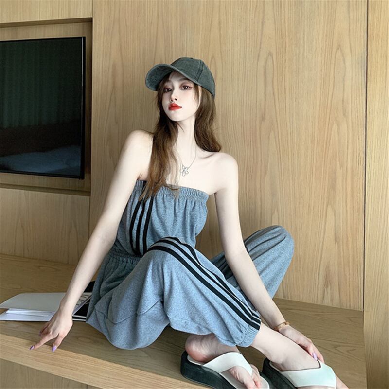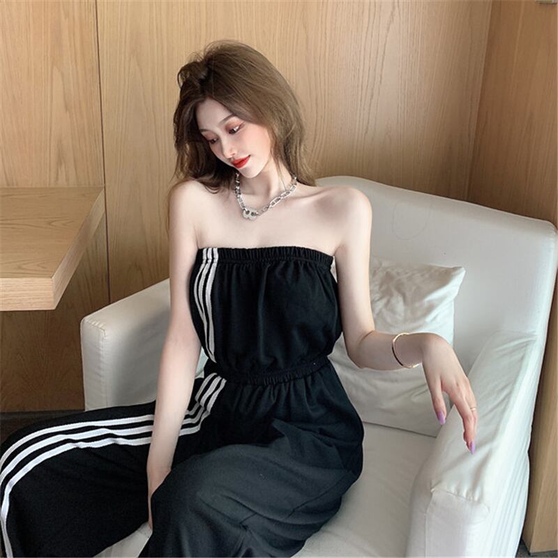 ジャンプスーツ オールインワン ハイウェストウェストルーズサマースタイルブラックスリムカジュアルストライプ 夏物 ブラックストロベリース40640338258