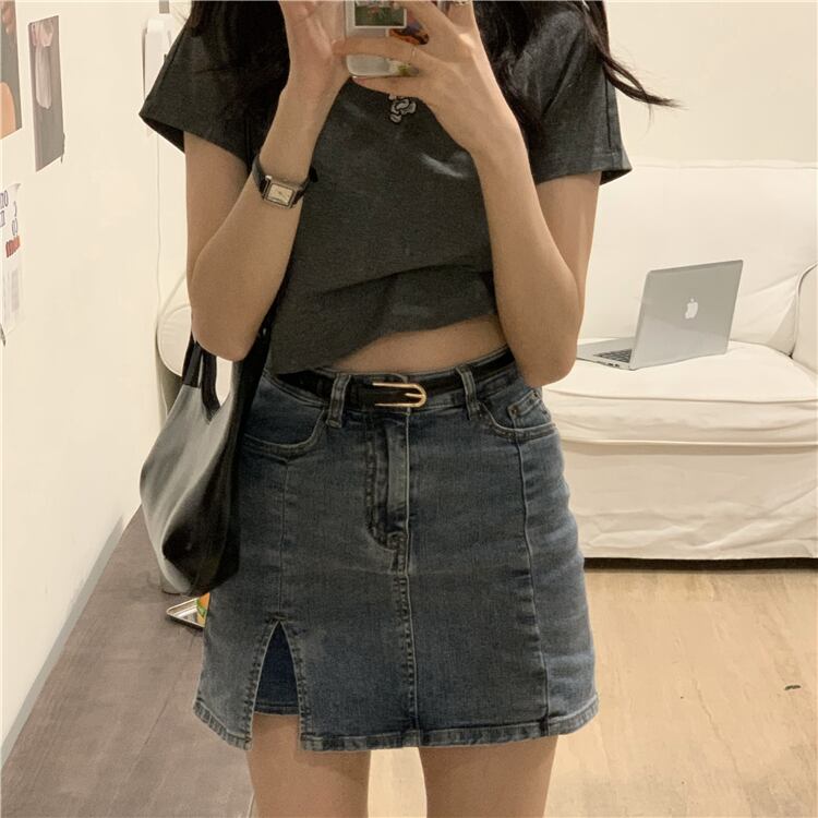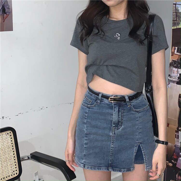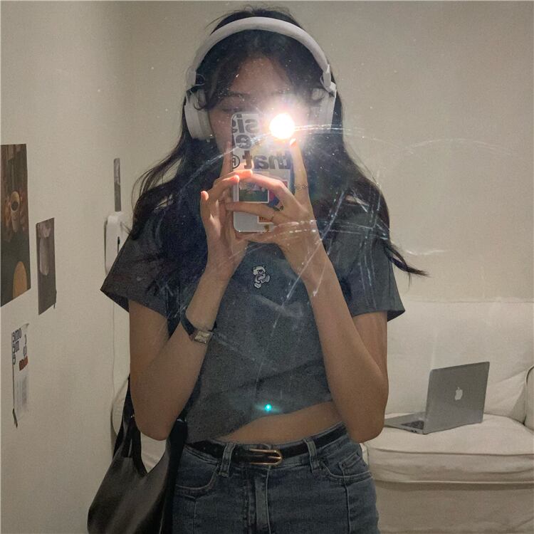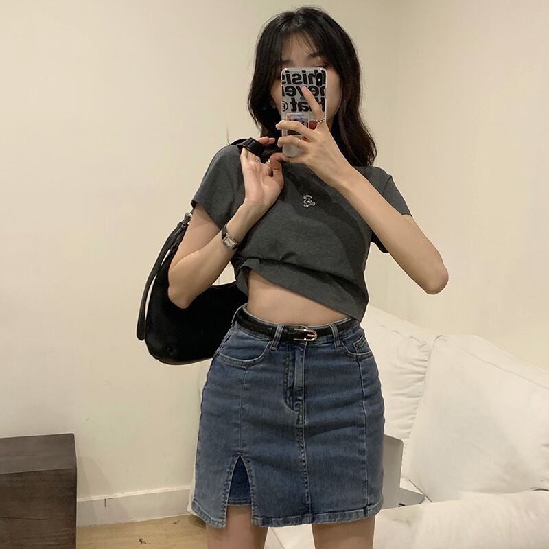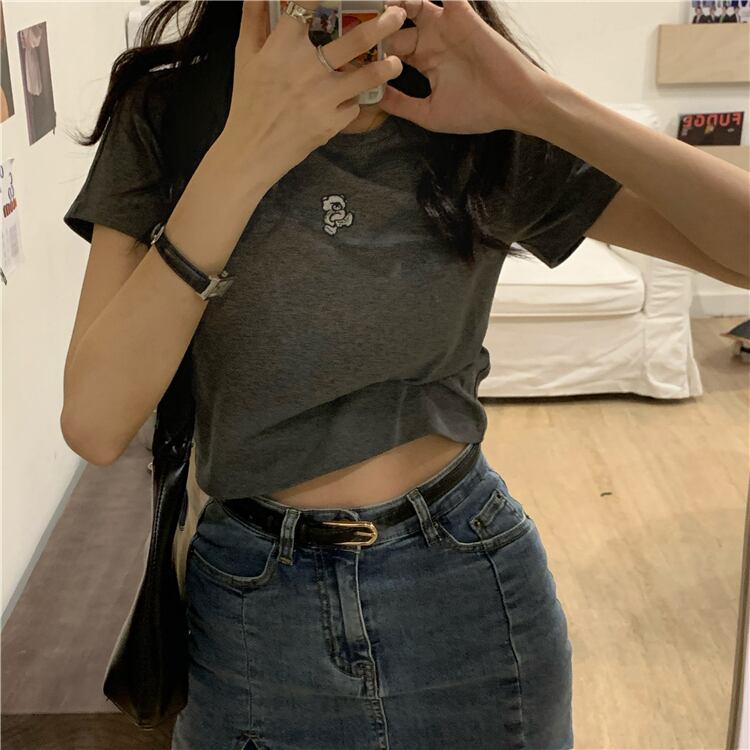 Tシャツ シャツ サマースタイルショートスリムハイウェストクロップドグレー 夏物 ブラックストロベリース69080257690