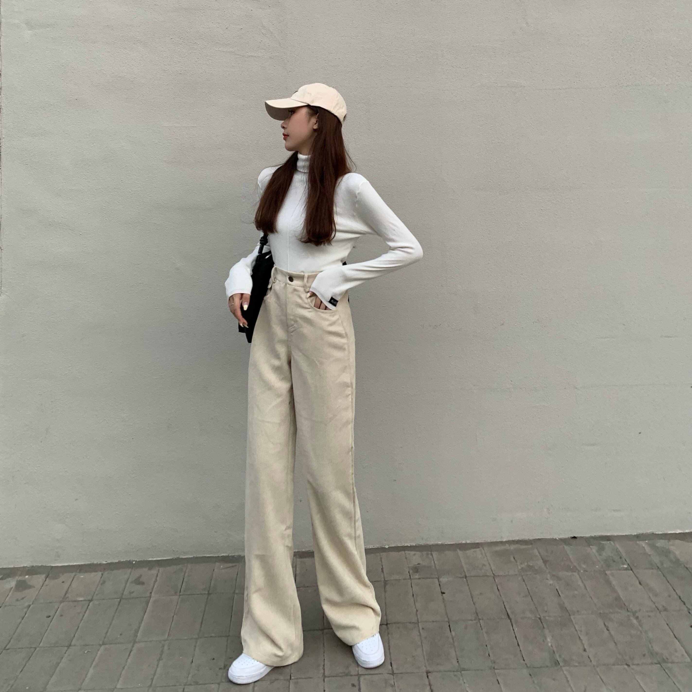 コーデュロイスプリングハイウェストスリムルーズブラックカジュアルパンツ 春物 ブラックストロベリース58446878131