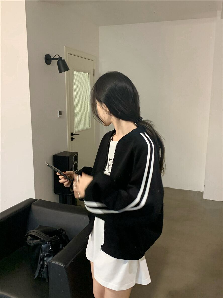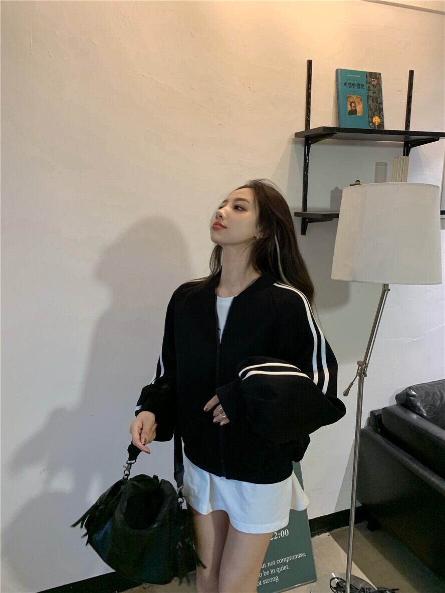 ショートカーディガンジャケット スプリングブラックルーズジッパートップス 春物 ブラックストロベリース45153689905