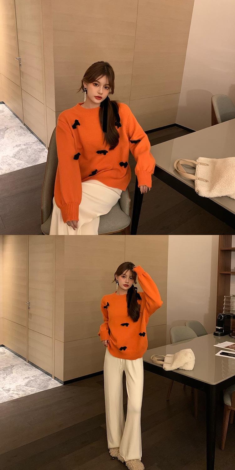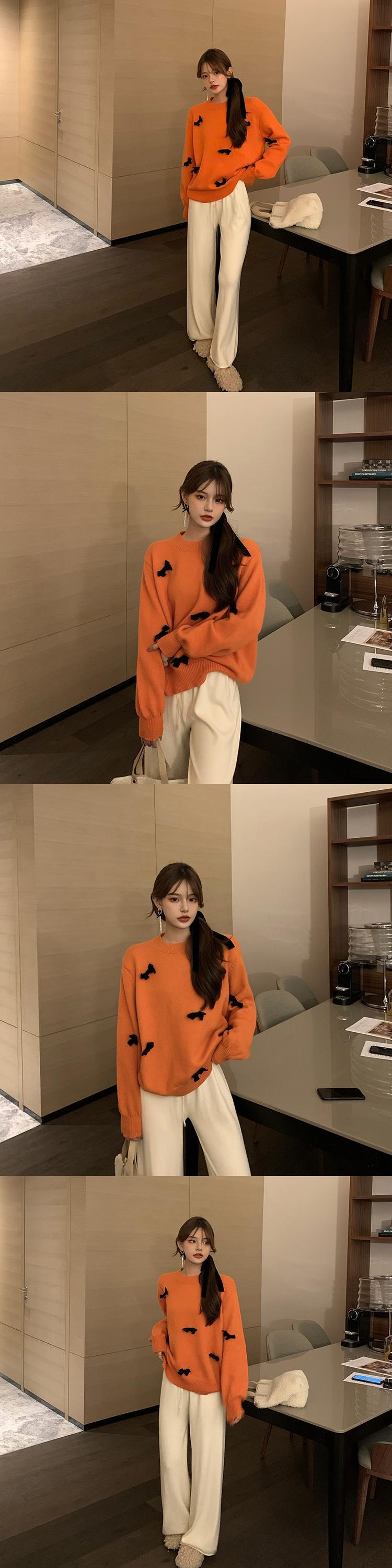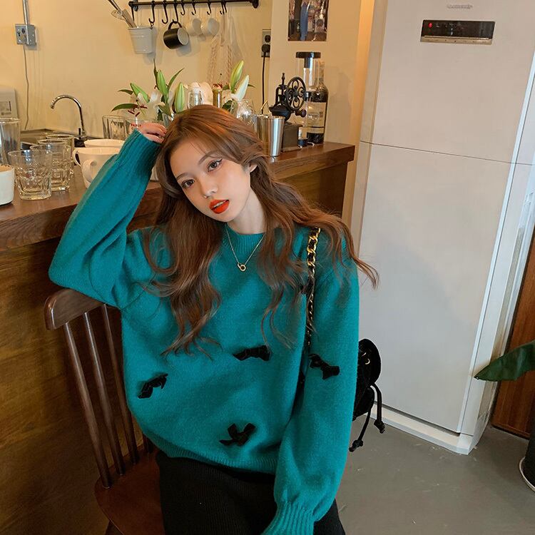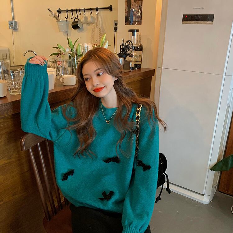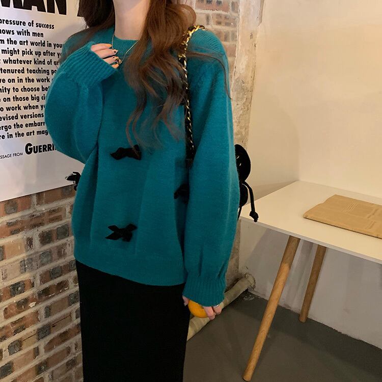 セーター ルーズニットスプリングホワイトスタンダードブラウス リボン レトロ 春物 ブラックストロベリース81555331086