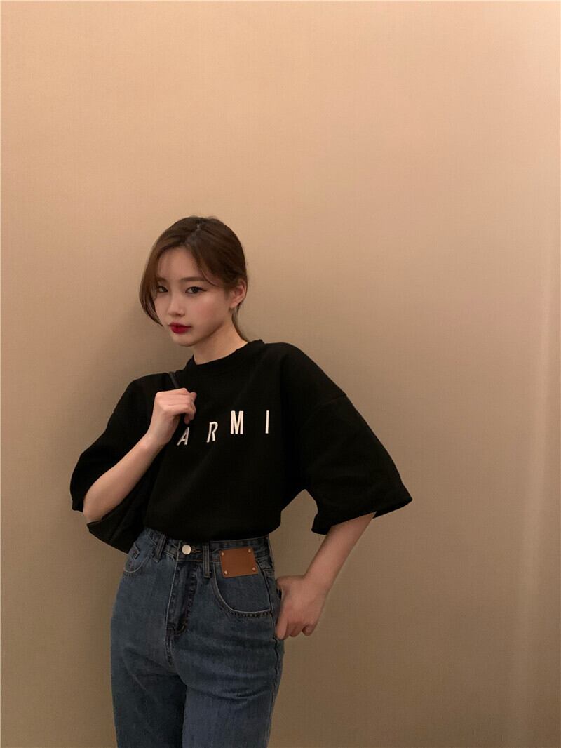 Tシャツ ホワイトルーズロングラウンドネックトップス サマー 夏物 Oネック ブラックストロベリース60534057448