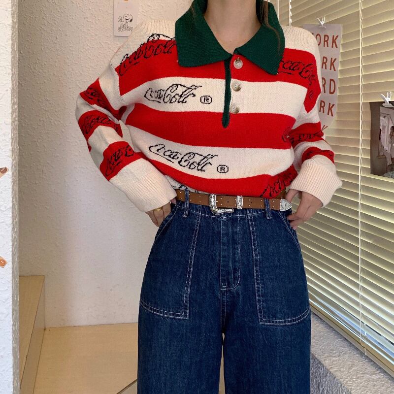 セーター レディースルーズカラーストライプレッドニットスプリングトップス 春物 ブラックストロベリース94329368845