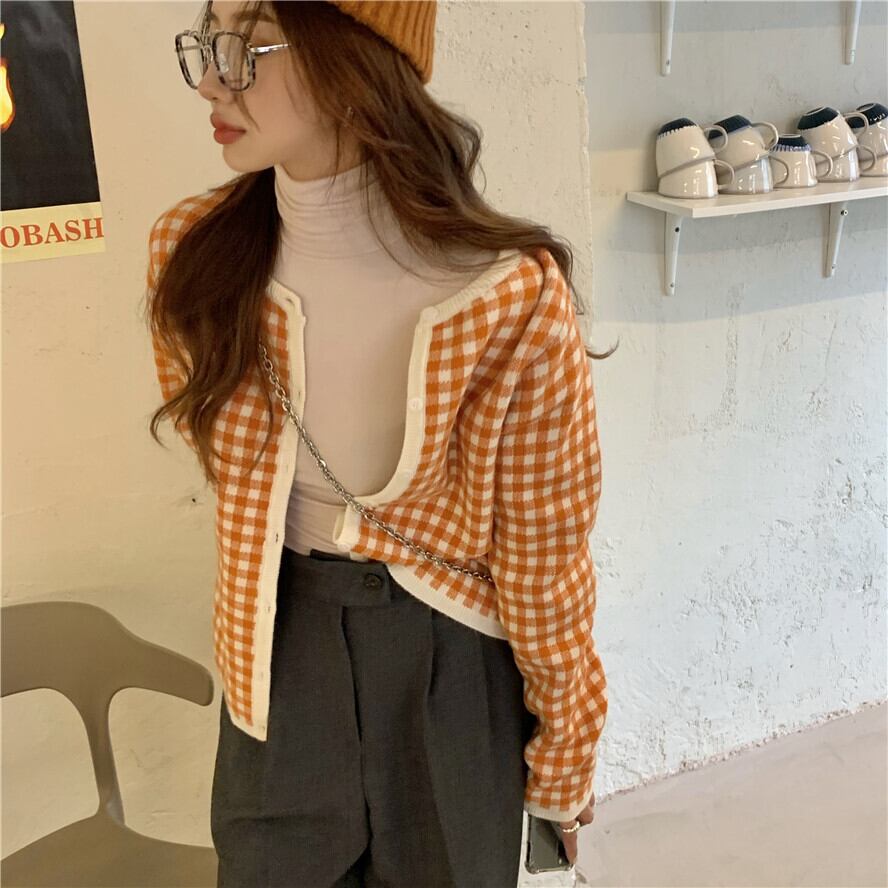 ニットセーター 格子柄カラースリムトップス スプリングスタンダードカーディガンジャケット レトロ 春物 ブラックストロベリース947297989