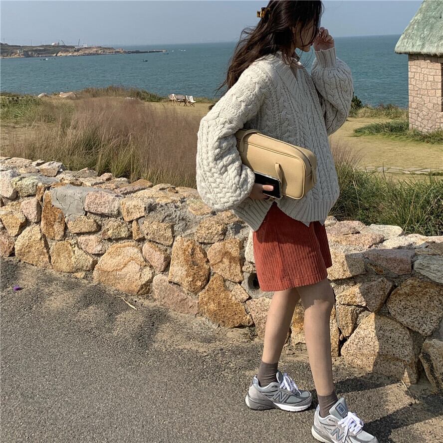 色:アプリコットセーター,コーデュロイパンツ,ベージュのシャツ