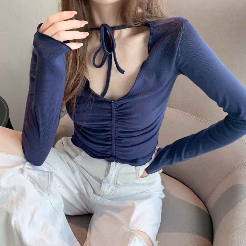 Tシャツ シャツ ショートスリムVネックスプリングトップス ロング 春物 ブラックストロベリース79046630616