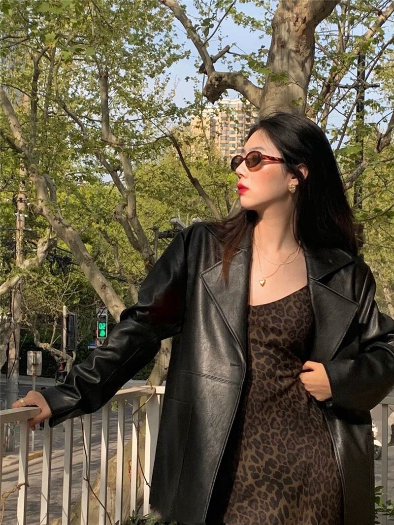 色:ヒョウ柄キャミソール,レザーブレザー