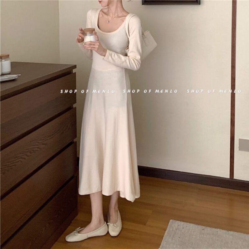 ニットドレス ウェスト長袖スリーブスカート スプリングレッドスリム ロング 春物 スクウェア ブラックストロベリース92455047638