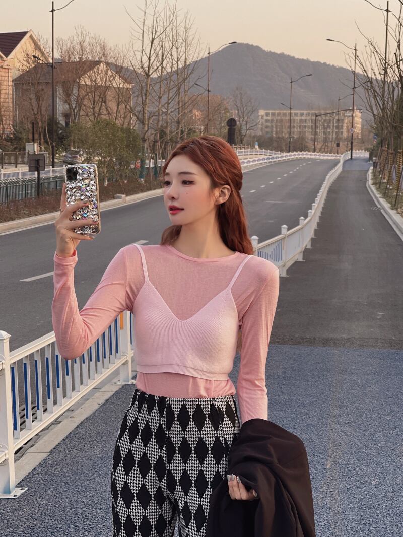 Tシャツ シャツ スリムスプリングラウンドネックトップス ロング ピンク 春物 Oネック ブラックストロベリース47605899407