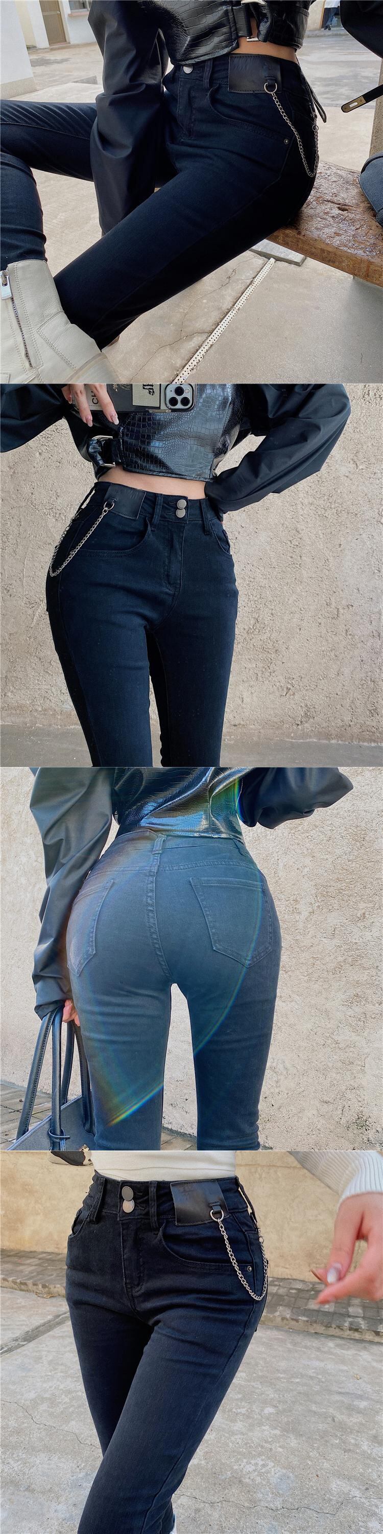 ジーンズ ブラックハイウェスト薄手スプリングストレッチチェーン パンツ エラスティック 伸縮 春物 ブラックストロベリース24296112153