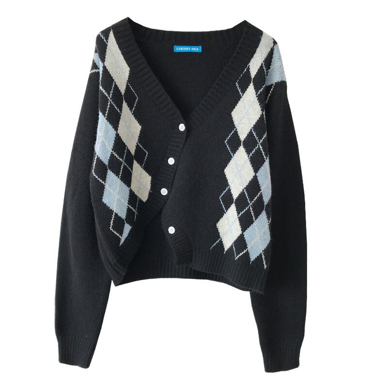 ニットセーター レディーススタンダードVネックブラックトップス スプリングスタイルカーディガンジャケット レトロ 春物 ブラックストロベリース15656014835