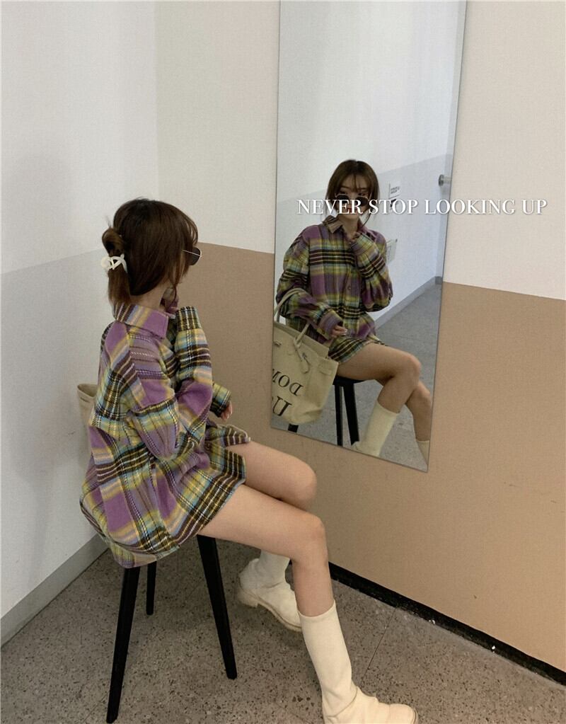 シャツ ルーズ格子柄ジャケット スプリングトップス ロング 春物 ブラックストロベリース92012648818