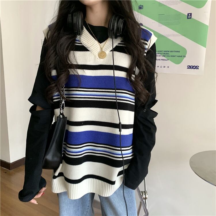 ストライプニットセーター レディースウィンタージャケット ルーズ 冬物 ブラックストロベリース15472505973