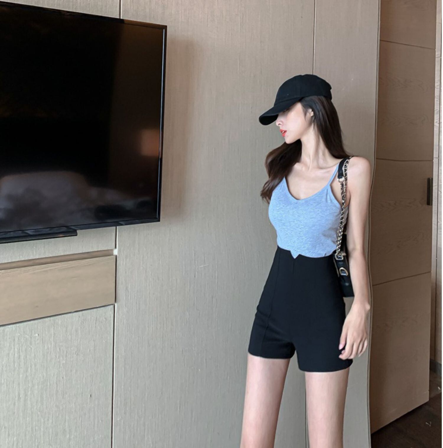 ハイウェストウェストカジュアルパンツ スプリングサマー薄手ショーツ スリム 春物 夏物 ブルマー シルク ブラックストロベリース75381919731