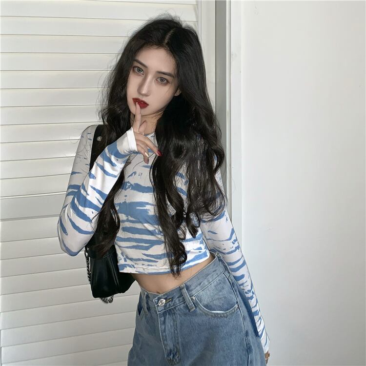 プリント柄ショートスリム長袖スリーブTシャツ ロング ブラックストロベリース67658077615