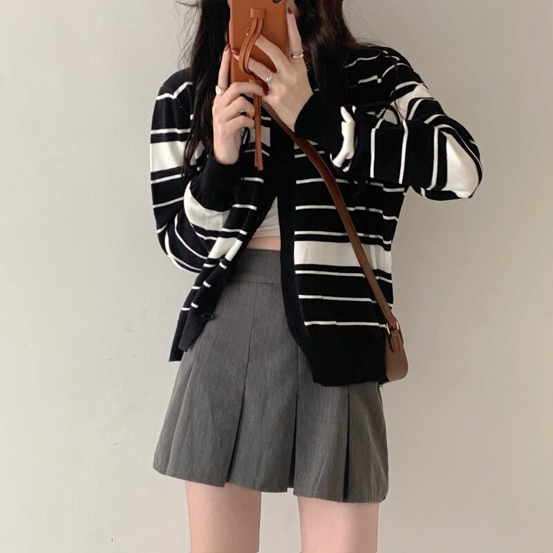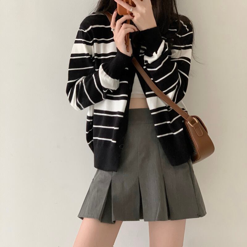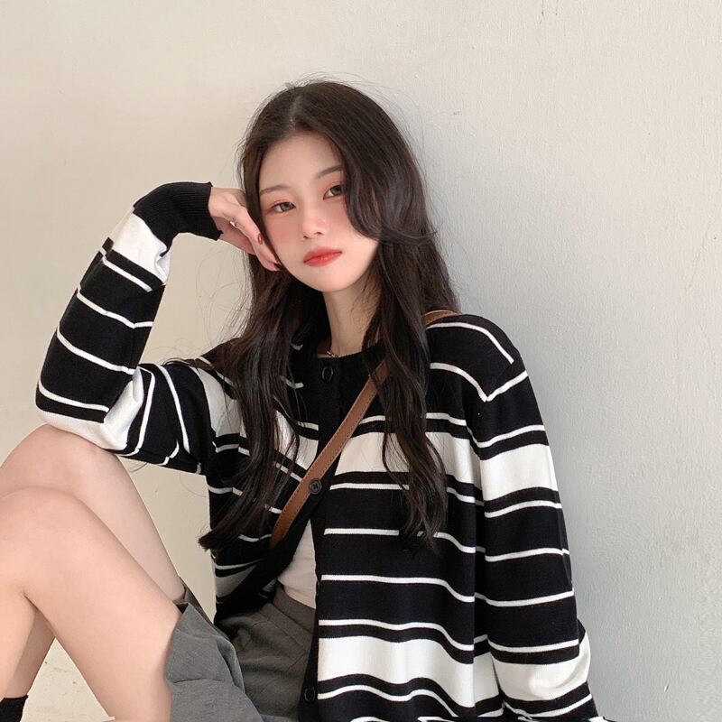 ニットセーター レディースルーズストライプトップス スプリングスタイルカーディガンジャケット 春物 ブラックストロベリース42602755625