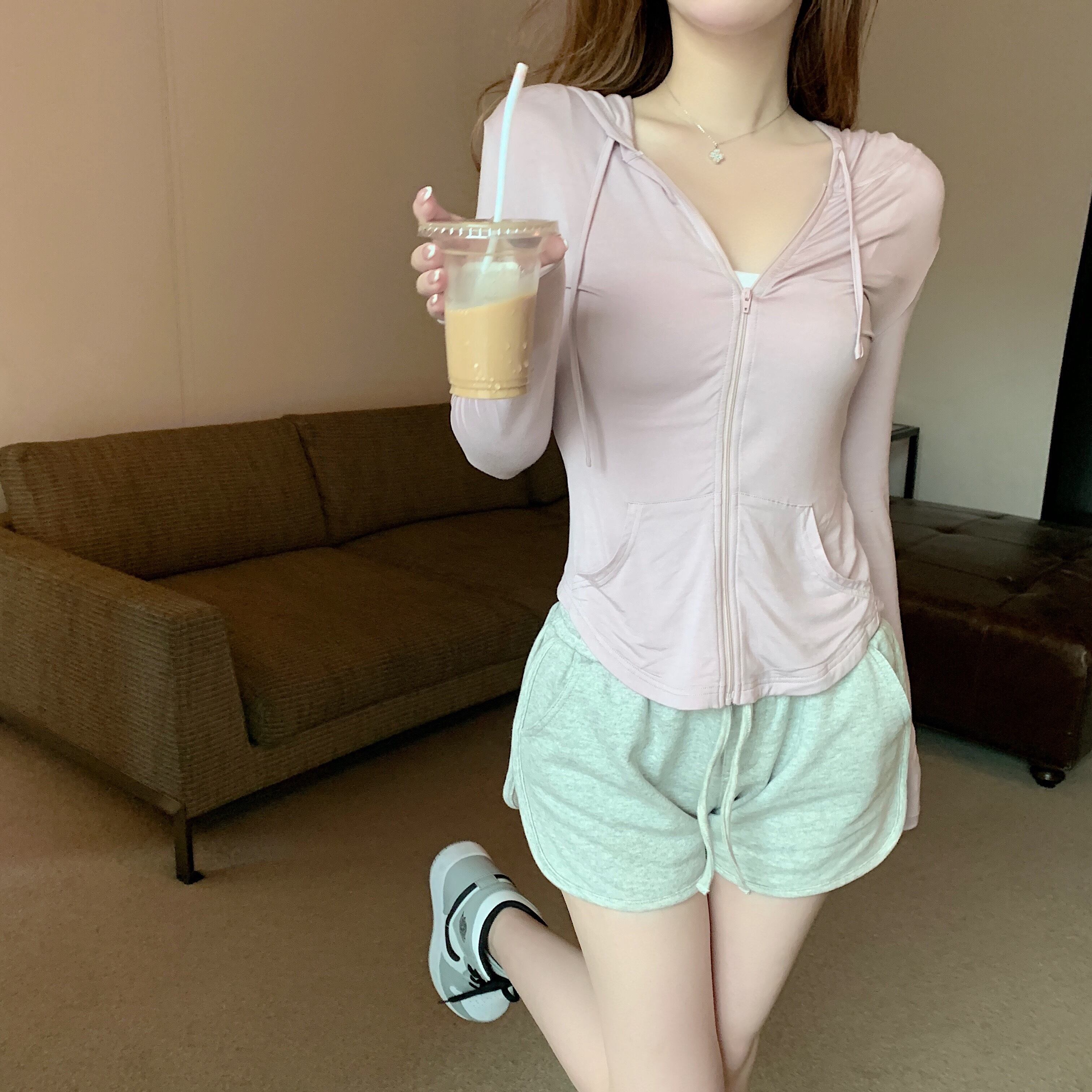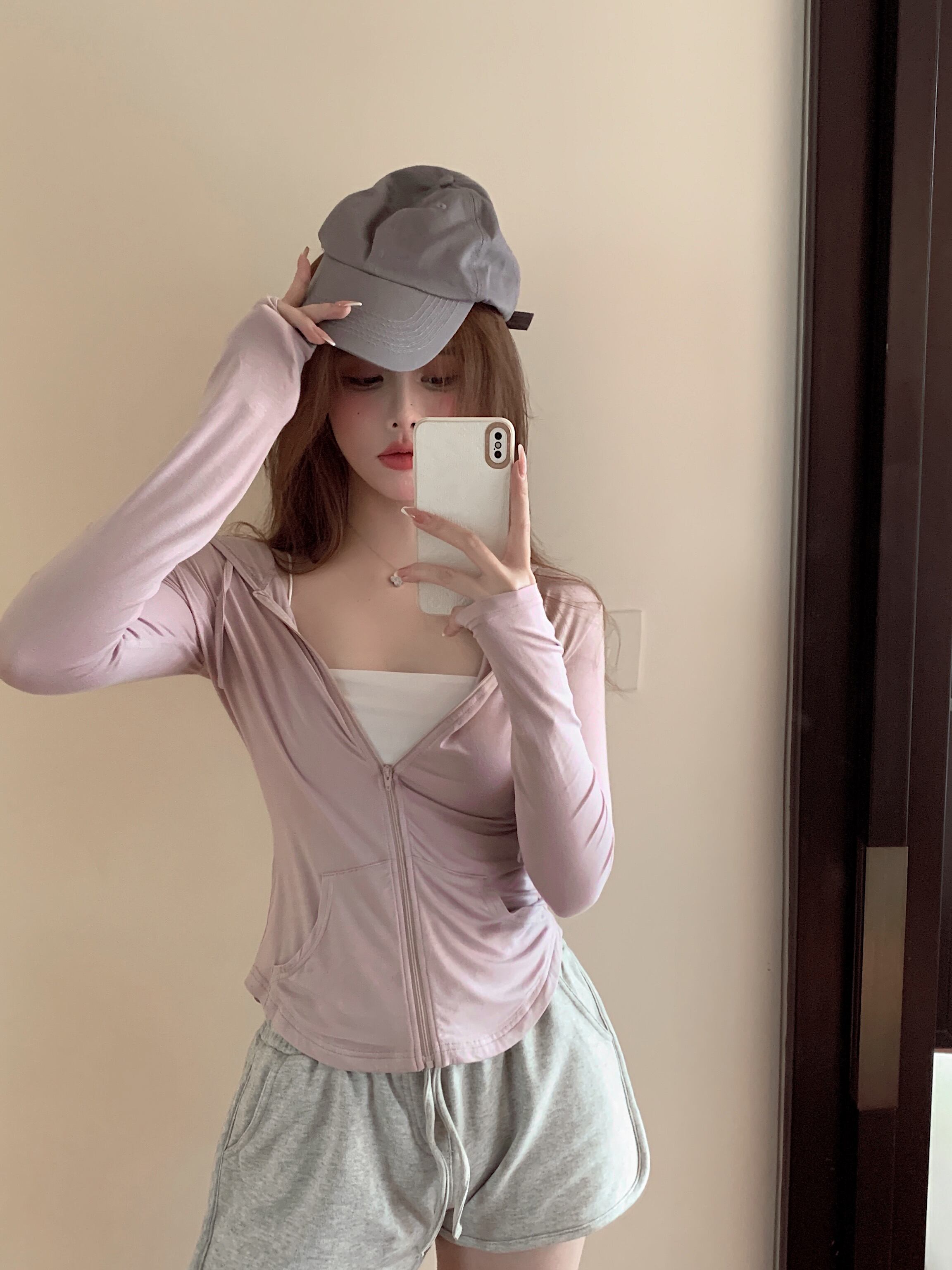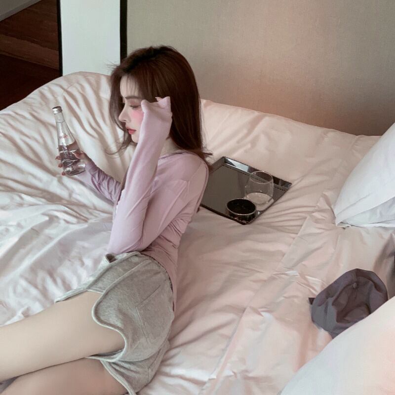 Tシャツ サマー薄手スリムフィットジッパーフードトップス ロング ピンク 夏物 ブラックストロベリース54155099443