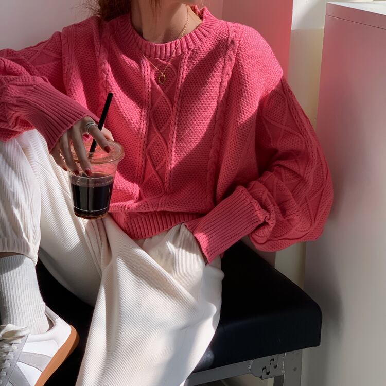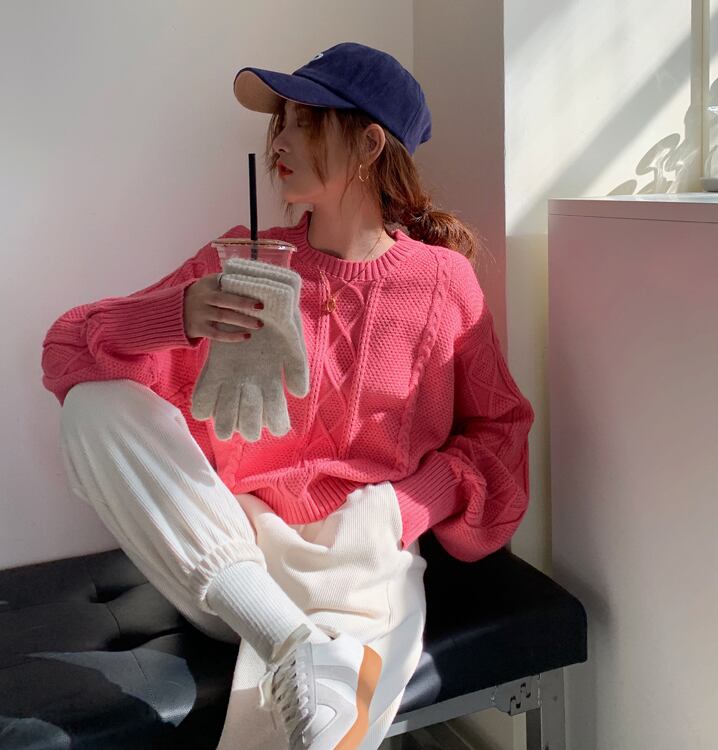 セーター レディースルーズスタンダードニットスプリングプルオーバー トップス ピンク レトロ 春物 ブラックストロベリース84087217751