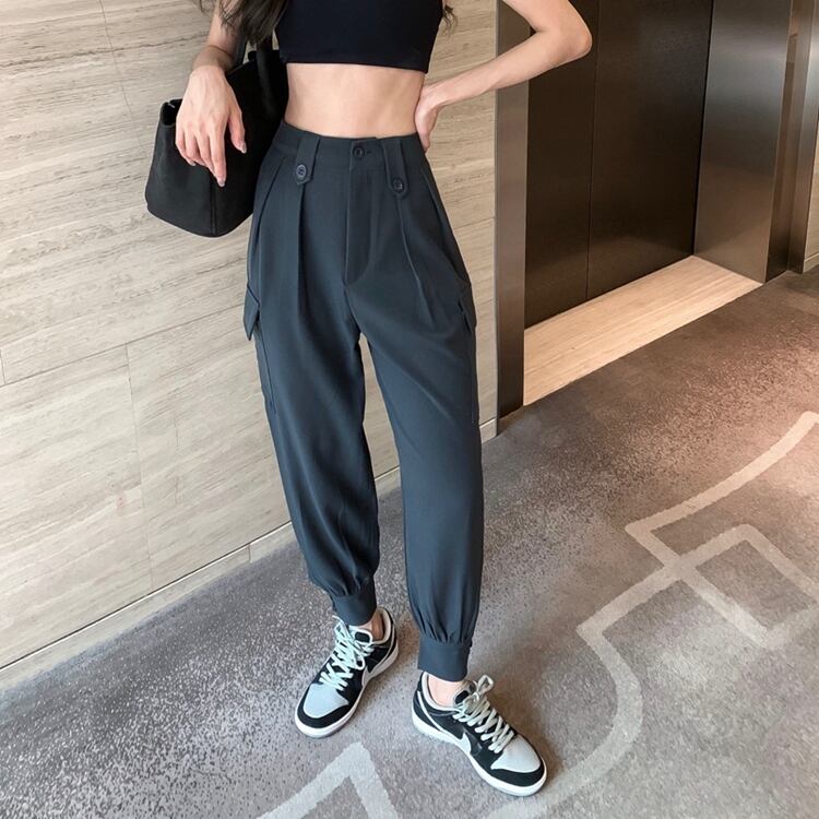 オーバーオール ハイウェストウェストルーズスプリングスタイルブラックカジュアルパンツ 春物 ブラックストロベリース79218226665