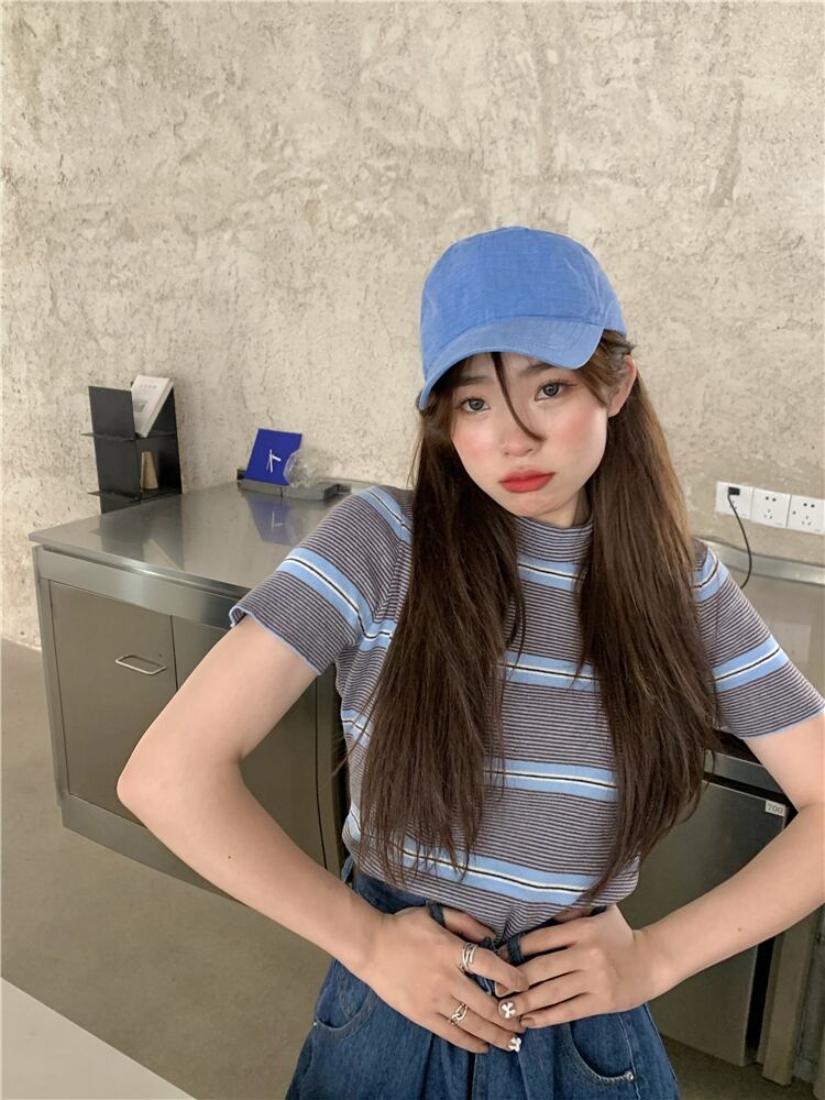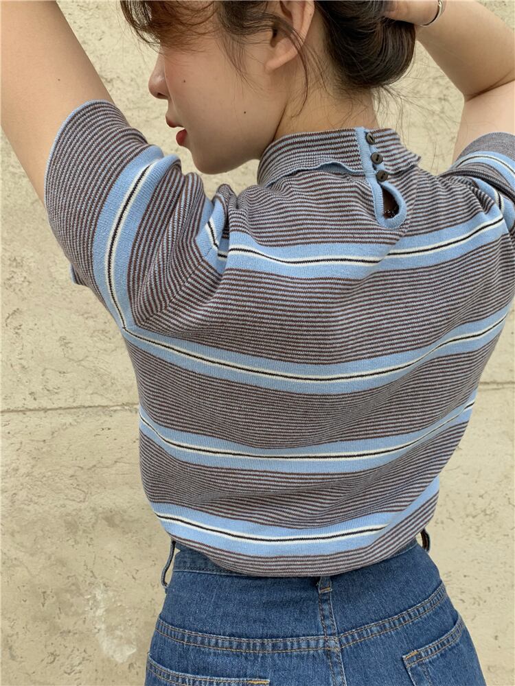 Tシャツ カラーストライプスリムトップス サマースタイル 夏物 ブラックストロベリース60645434988