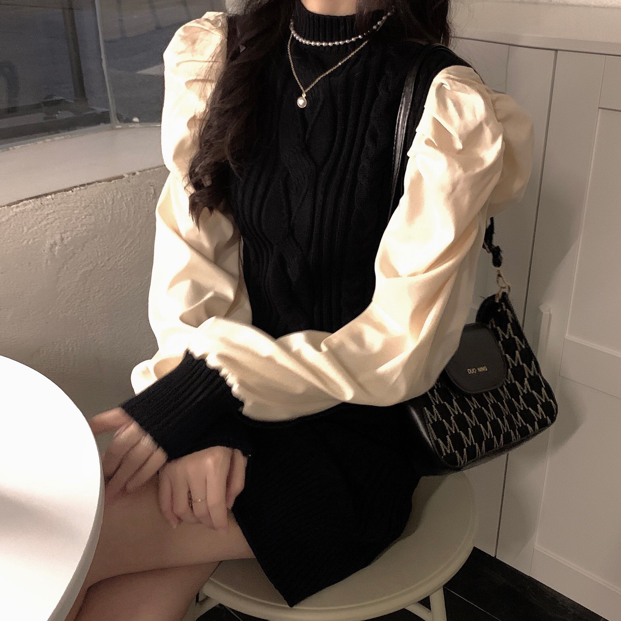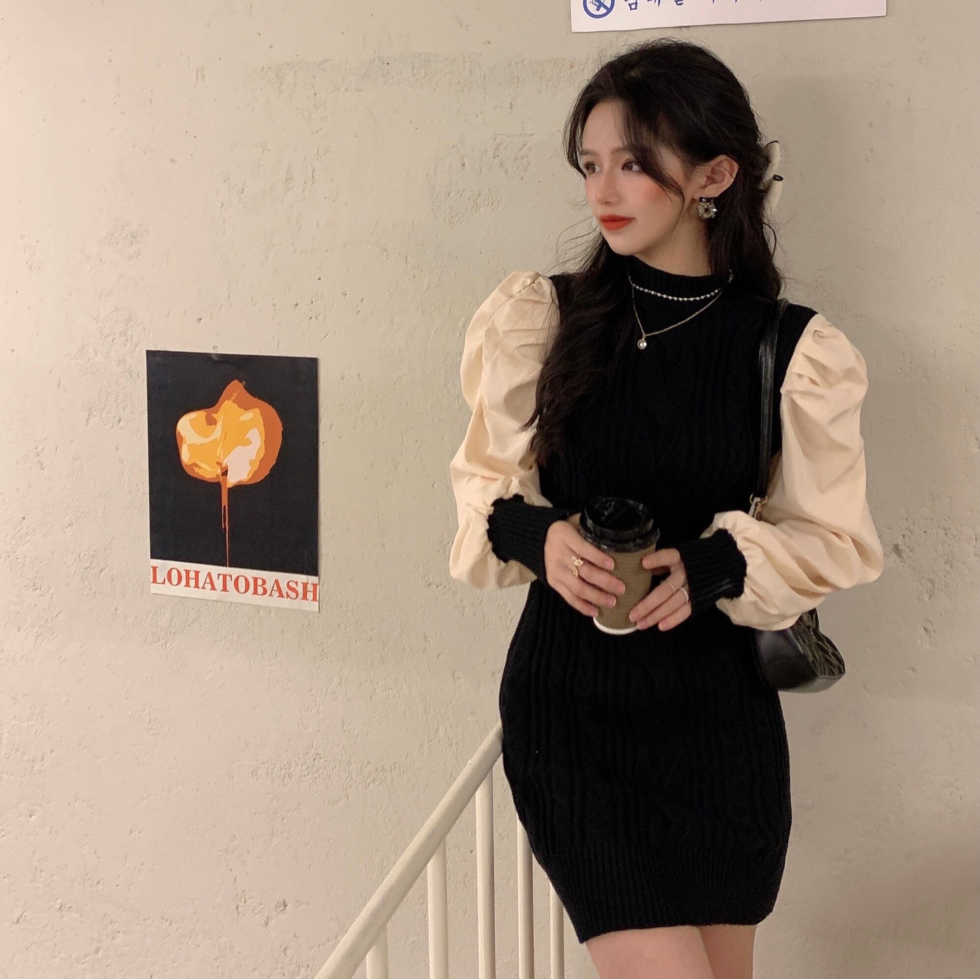 ニットドレス スリーブロングショートスカート スプリング 長袖 春物 ブラックストロベリース64889727451