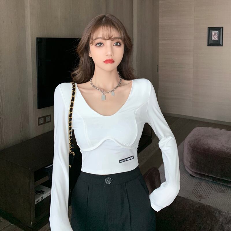 Tシャツ シャツ ショートVネックホワイトスプリングスタイルトップス ロング 春物 ブラックストロベリース17176007592