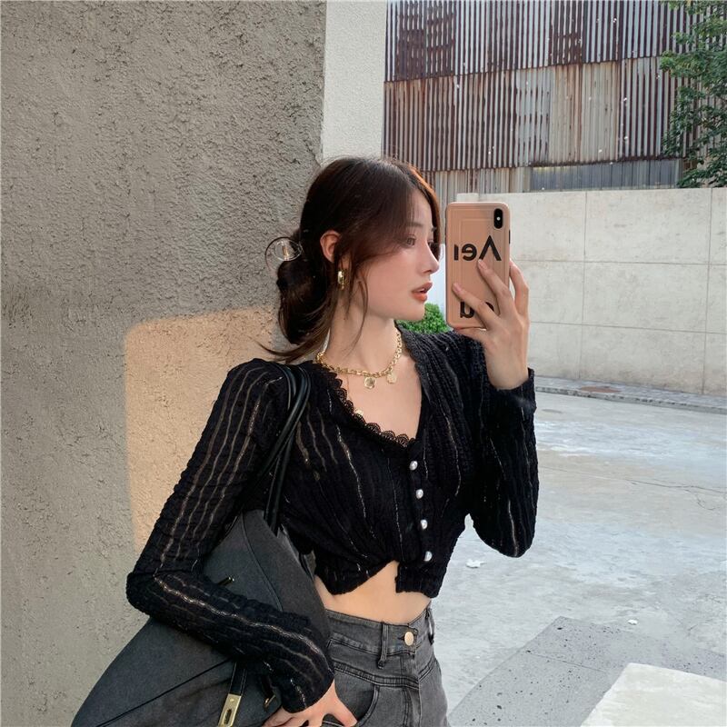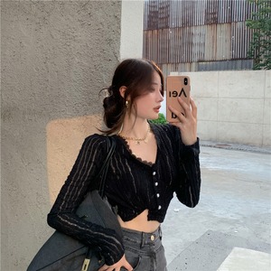 レースシャツ レディーススプリングVネックホワイトショートカーディガン ロング 春物 ブラックストロベリース96944209507