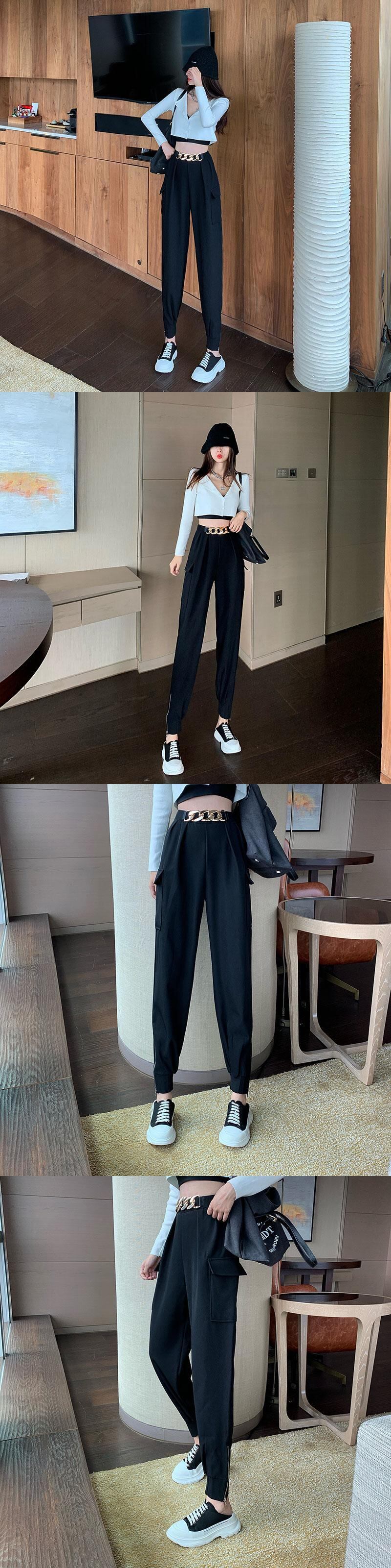 カジュアルパンツ ウェストハイウェストルーズスプリングスリム 春物 ブラックストロベリース41800196992
