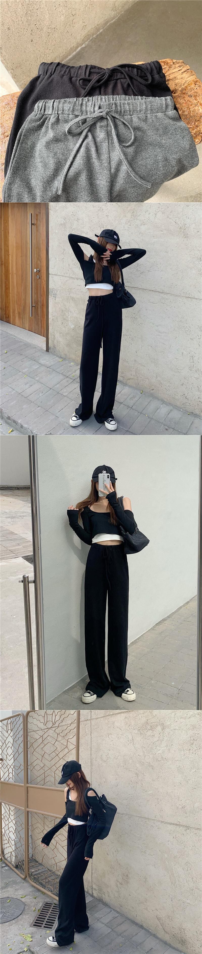 カジュアルパンツ スプリングストレッチウェストハイウェストルーズワイドレッグブラック エラスティック 伸縮 春物 ワイドパンツ ブラックストロベリース29748098734