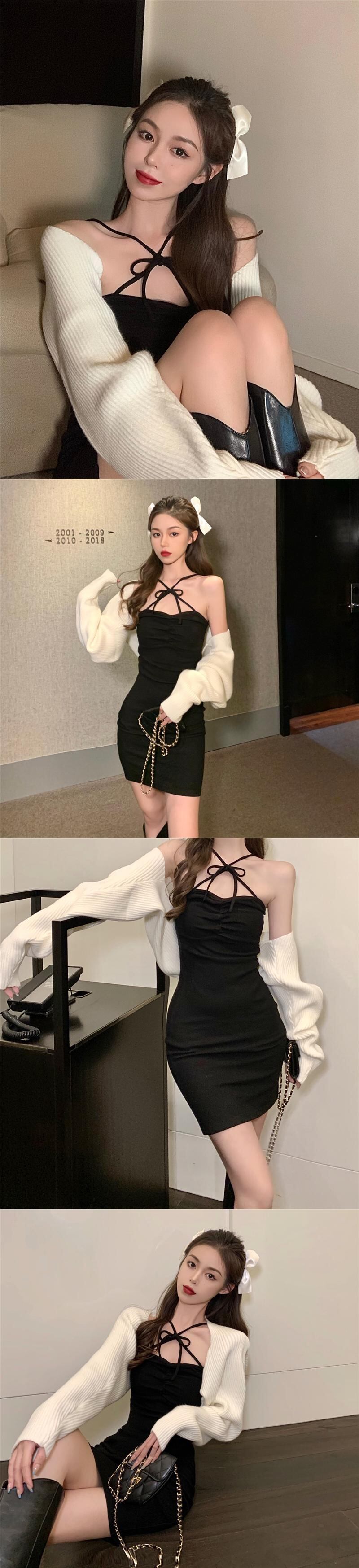 色:カーキセーターコート,白いセーターコート,アプリコットドレス,ブラックサスペンダースカート