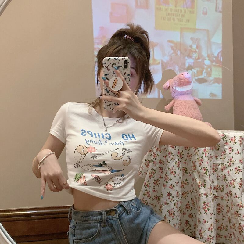 Tシャツ スリムショートホワイトハイウェストウェスト半袖スリーブトップス スプリングサマースタイル ハーフスリーブ 春物 夏物 ブラックストロベリース72963221349