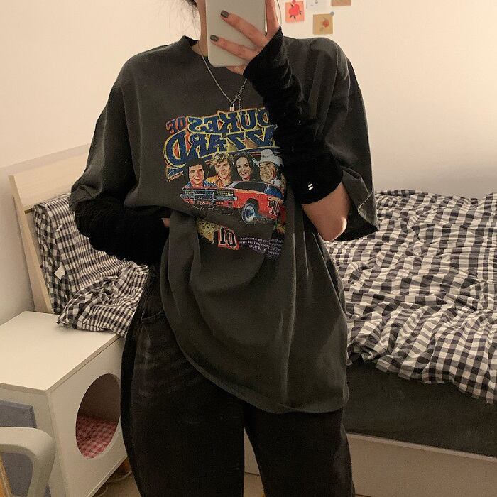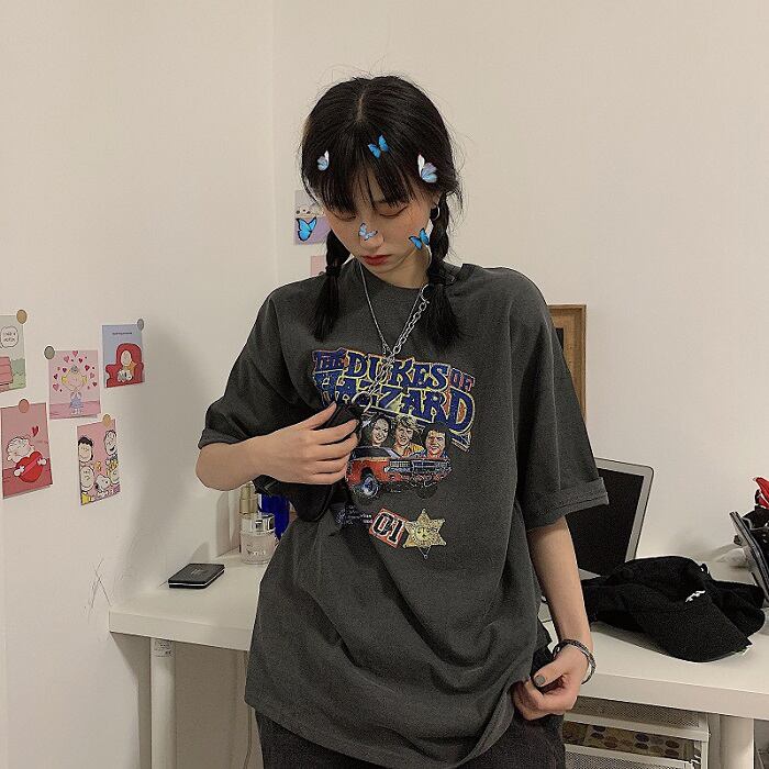 Tシャツ サマースタンダードスタイルプリント柄ルーズトップス レトロ 夏物 ブラックストロベリース65351650922