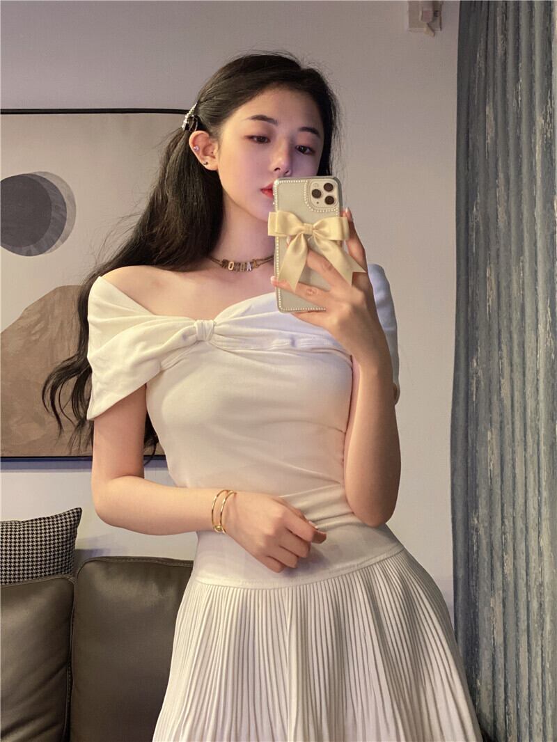 ホワイトTシャツ サマーリボン薄手トップス 夏物 オフショルダー ブラックストロベリース33518741346