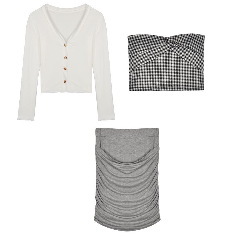 色:チェック柄チューブトップ,スカート,白いカーディガン