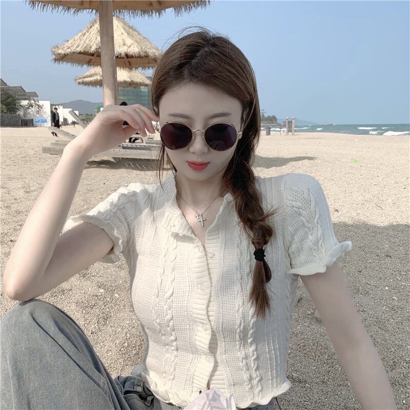 スタンダードニットカーディガンジャケット サマー薄手シャツ レトロ 夏物 ブラックストロベリース846584278