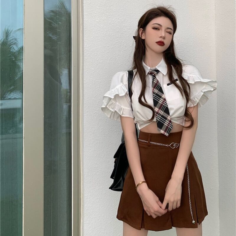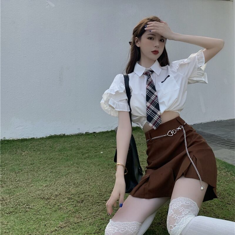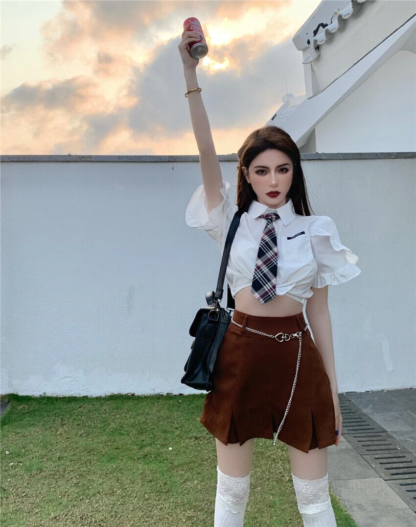 色:白いシャツ(ネクタイを送る),コーヒーカラーのスカート(チェーンを送る)