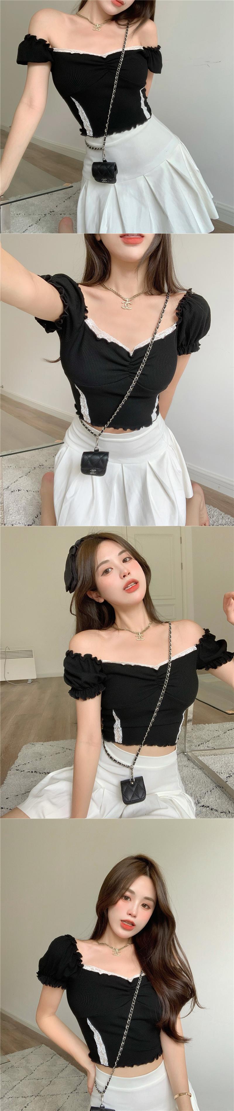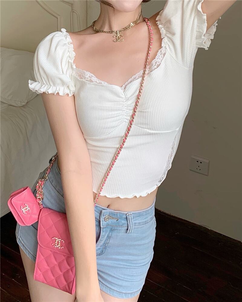 Tシャツ レーススリーブショートスリムホワイト半袖トップス サマー ハーフスリーブ 夏物 ブラックストロベリース24353056816