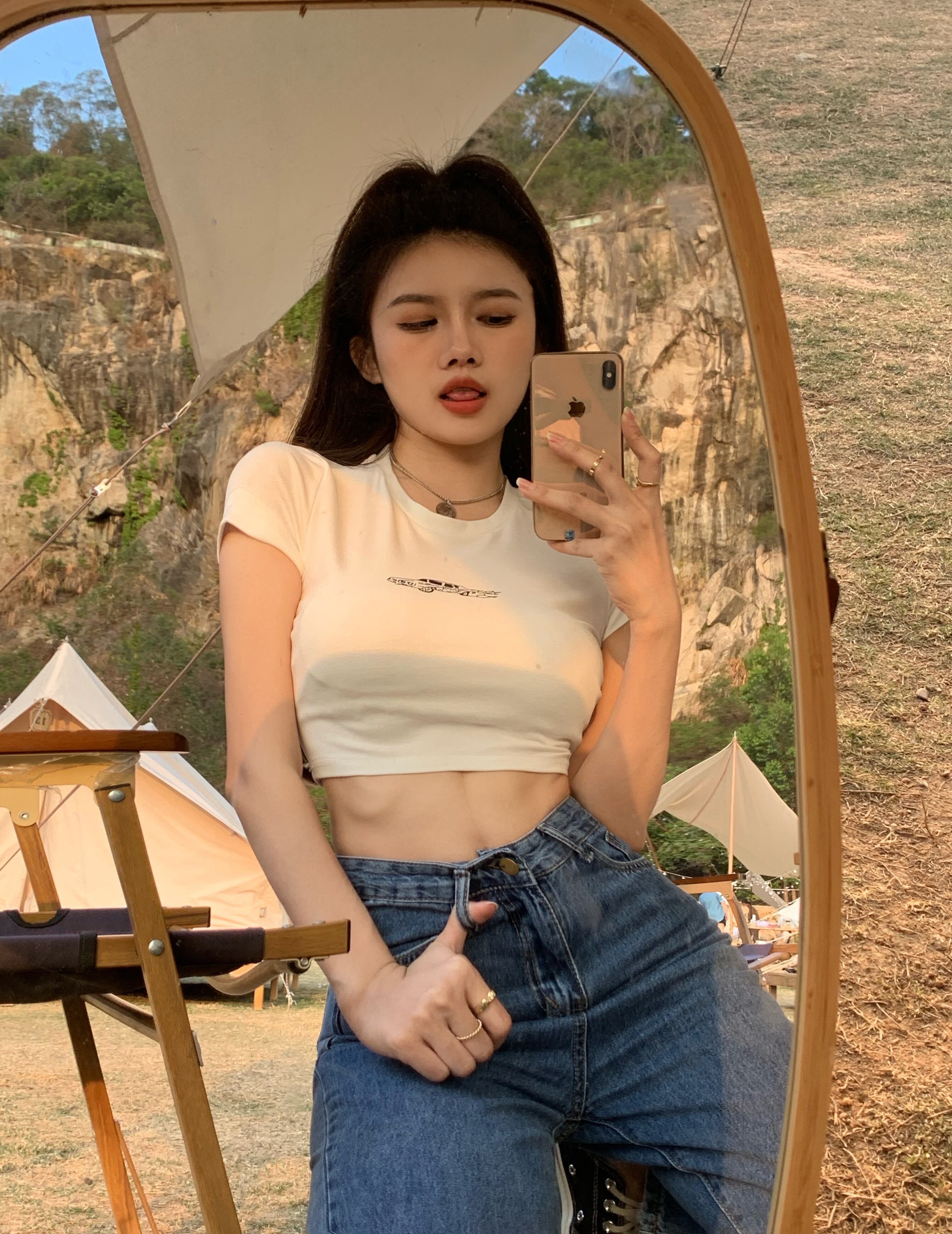 Tシャツ サマープリント柄スリムショートクロップドホワイトトップス 夏物 ピュア ブラックストロベリース90565318218