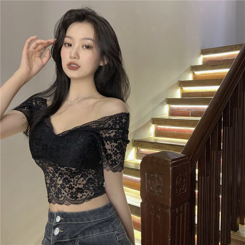 レースシフォンTシャツ レディースサマーホワイトVネックショートトップス 夏物 ブラックストロベリース53967301563