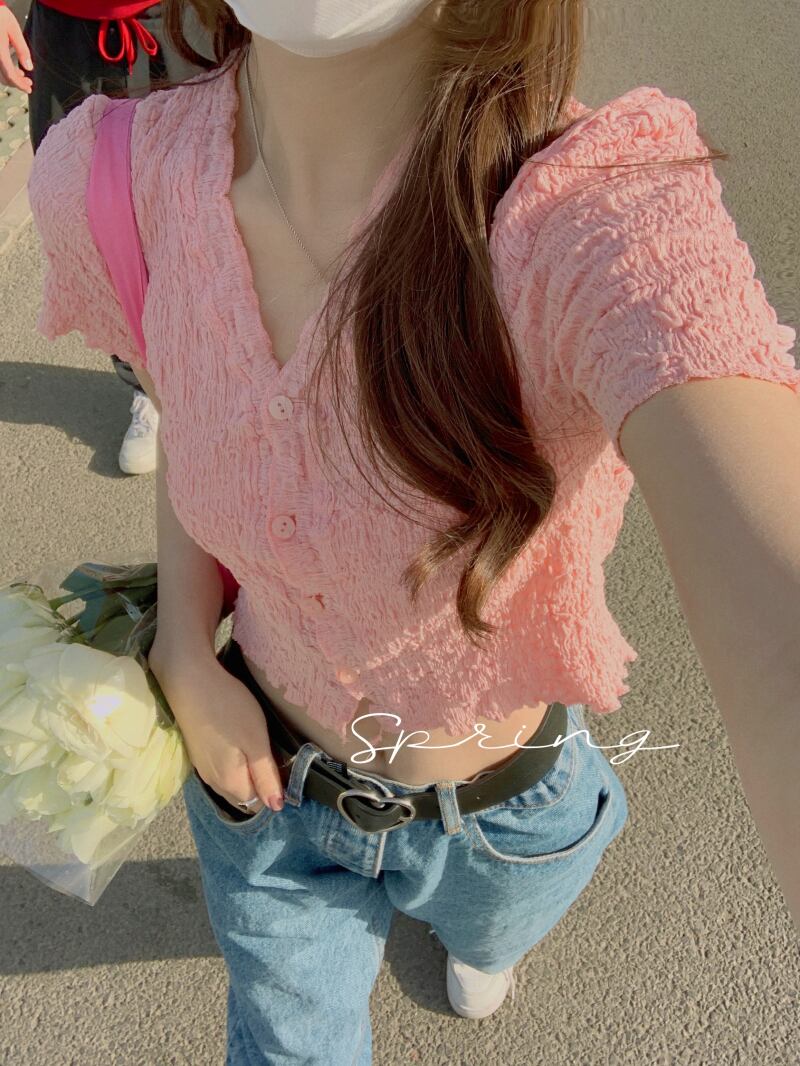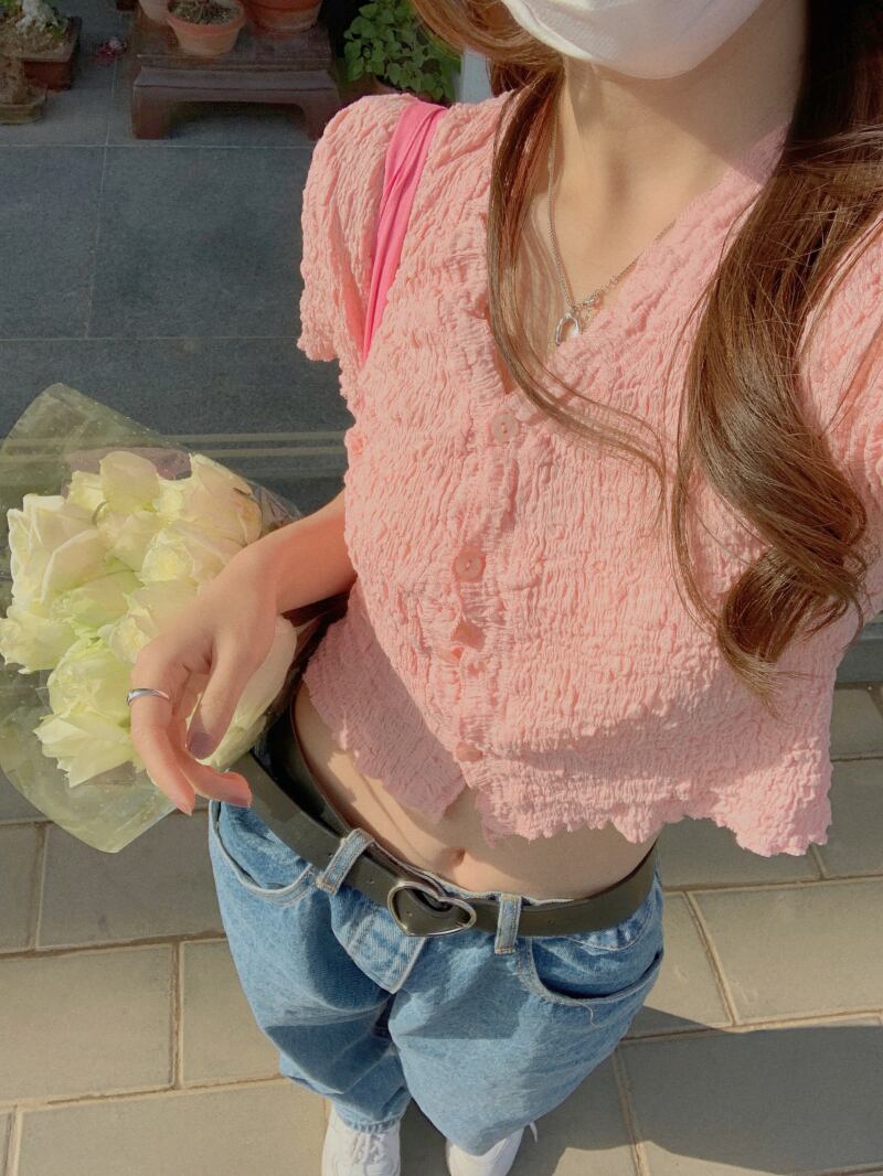 Tシャツ ショートクロップドスリム薄手Vネックトップス サマー ピンク 夏物 ブラックストロベリース34477339658