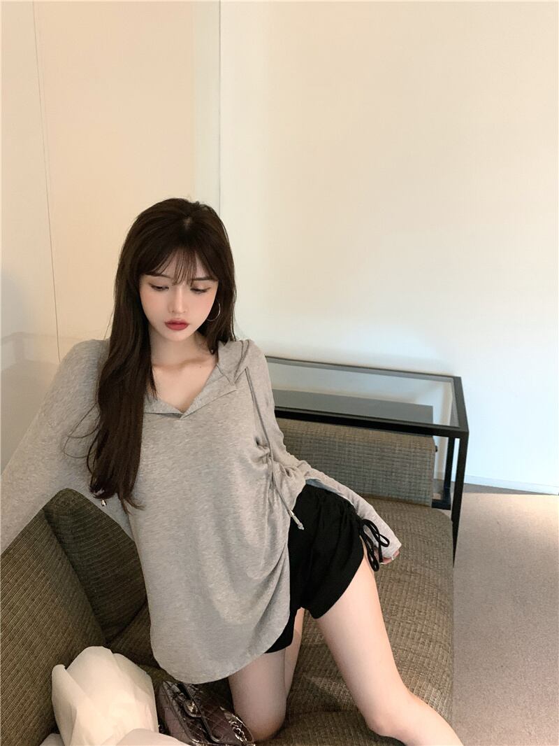 Tシャツ ルーズ薄手スタイルグレーフードトップス サマー ロング 夏物 ブラックストロベリース99269242968