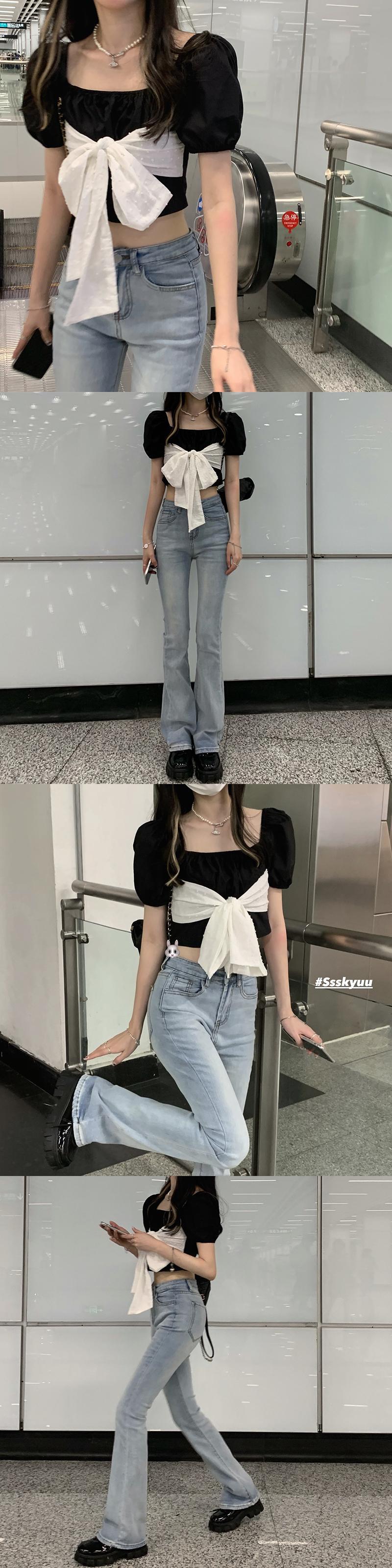 スタンダードスリーブドレス サマーショートスカート ブラックウェスト リボン レトロ 夏物 スクウェア ブラックストロベリース71779399027