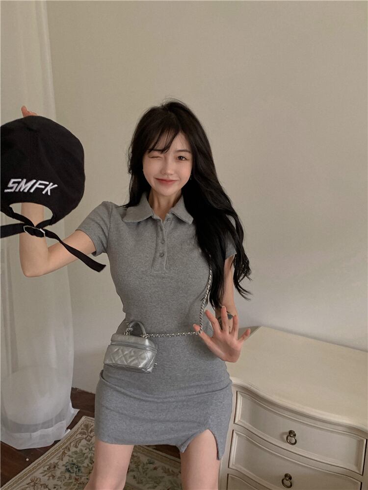 スタンダードカラーニットドレス ショートスカート サマー レトロ 夏物 ピュア ブラックストロベリース59057004956