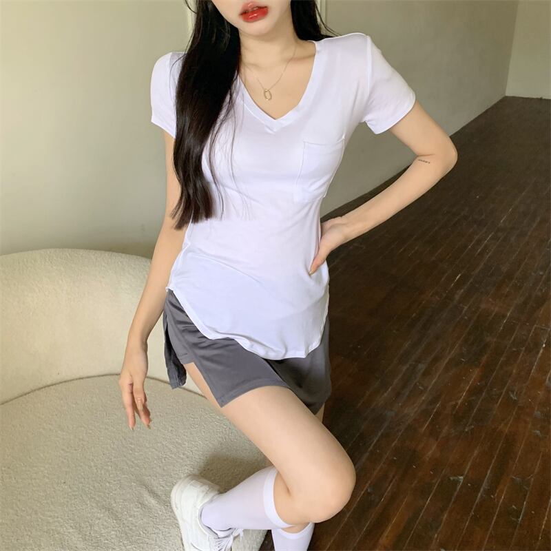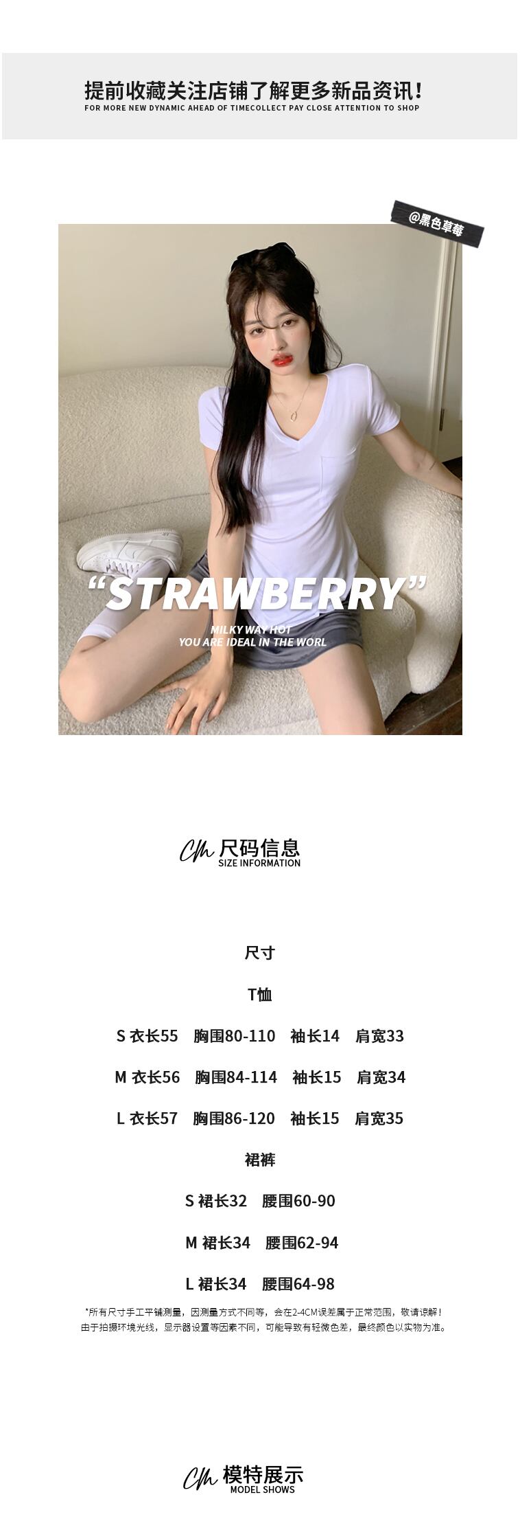 Tシャツ ホワイトスリムVネックトップス サマースタイル 夏物 ブラックストロベリース35320865745