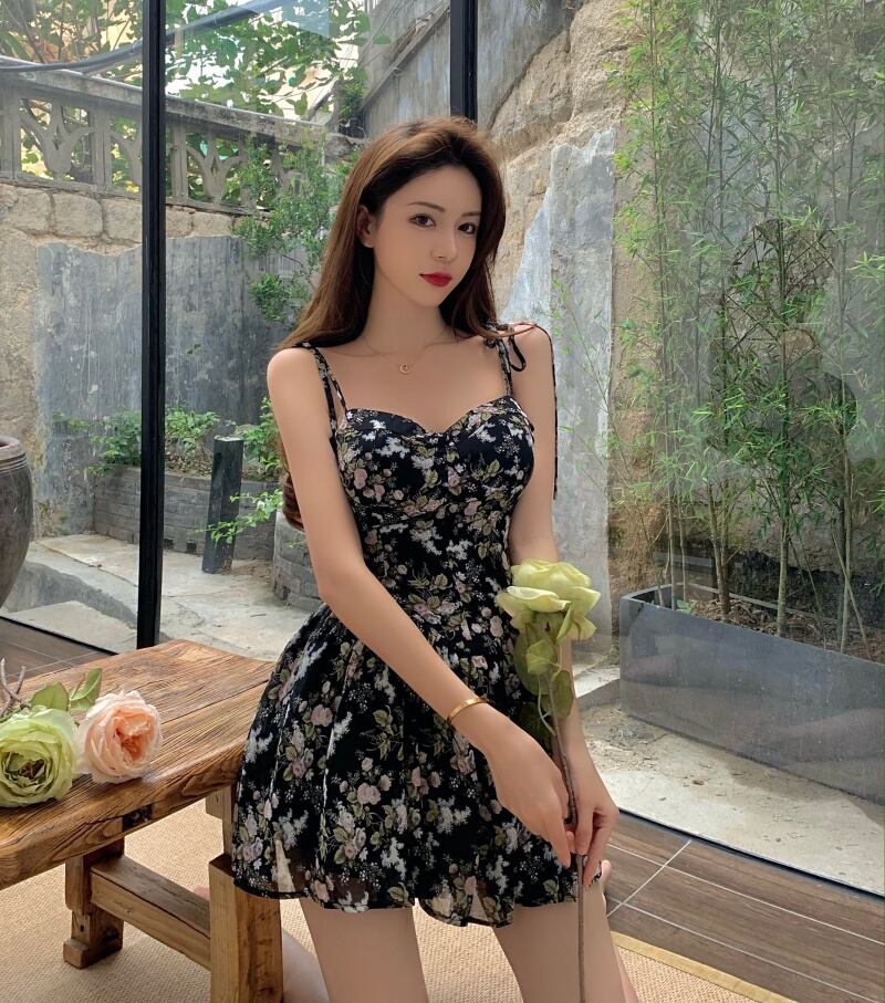 フローラルドレス シフォンウェストショートスカート サマー 夏物 花柄 ピュア ブラックストロベリース93856305821