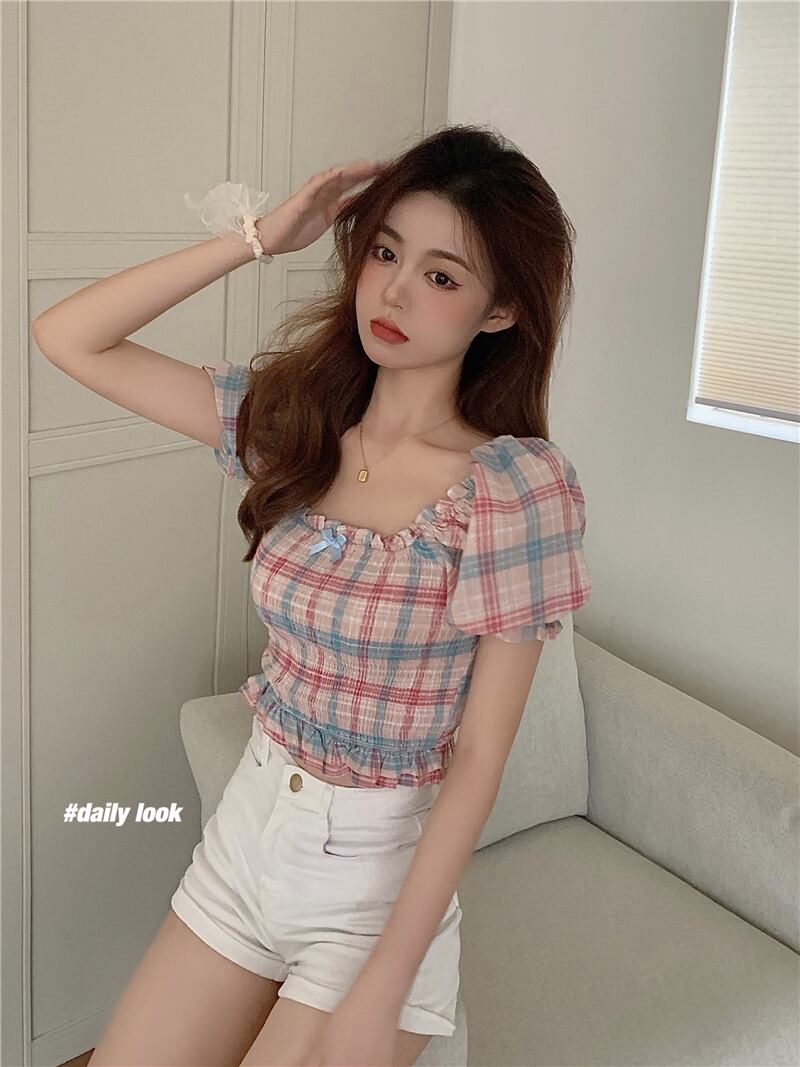 シフォンシャツ ショートサマートップス リボン 夏物 ブラックストロベリース18950276432