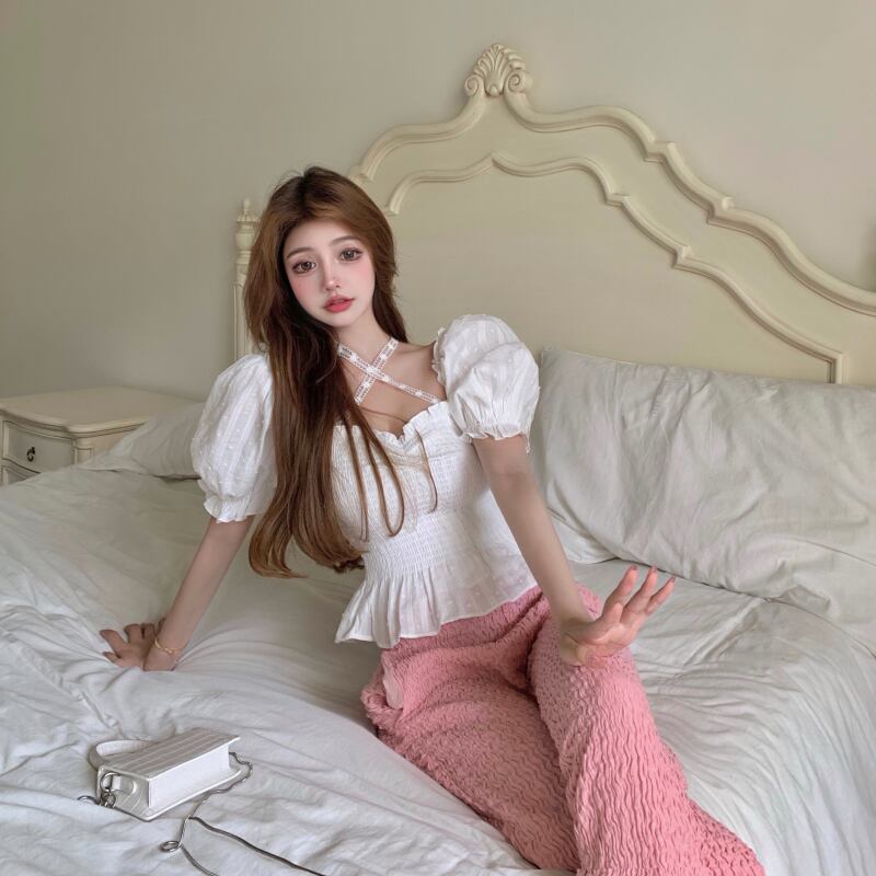 レーススリーブシャツ サマーショートホワイトカラー半袖トップス ハーフスリーブ 夏物 スクウェア ブラックストロベリース51046007281