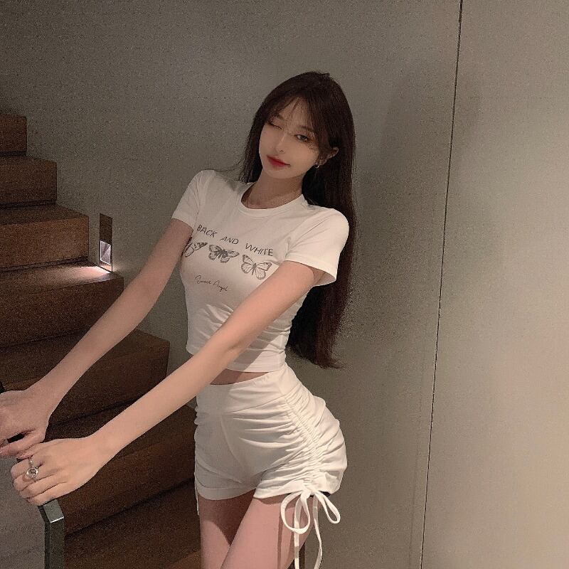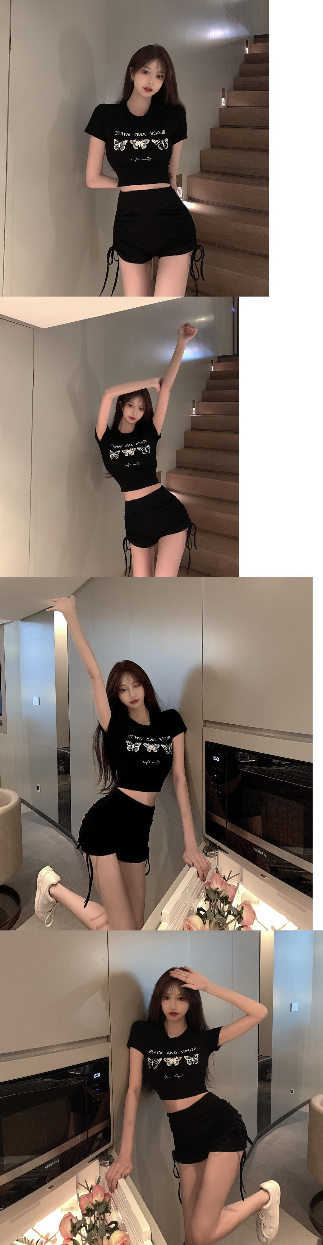 Tシャツ Butterflyデザイン プリントショートスリムホワイトトップス サマー 夏物 ピュア ブラックストロベリース55166210642